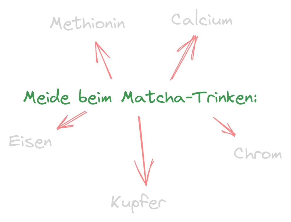 Matcha sollte nicht zusammen mit eisenhaltigen Lebensmitteln aufgenommen werden, da sich beide jeweils bei der Aufnahme behindern und somit eine Eisenmangel-Anämie begünstigen könnten. Neben Eisen kann grüner Tee auch Kupfer und Chrom sowie Cadmium binden.